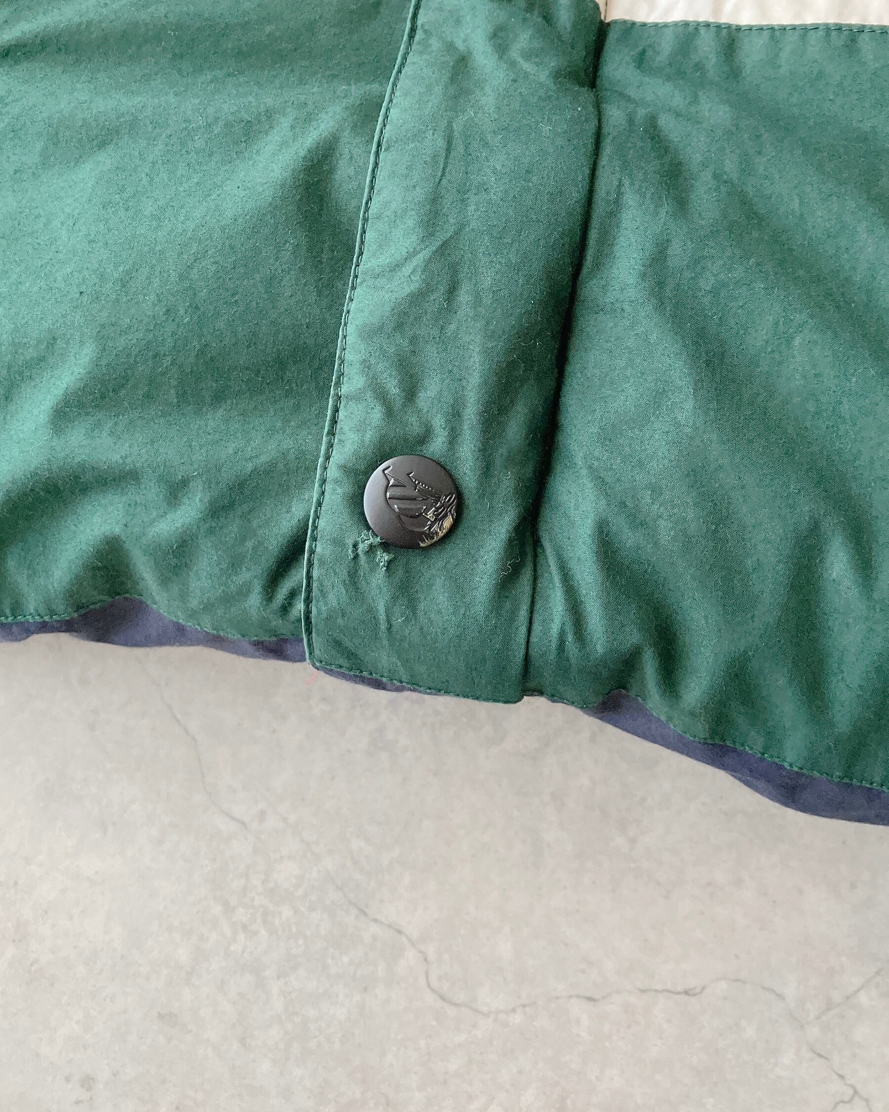 多少の使用感。マルチボーダー側の白いライン部分に薄く赤い色移り。下から2番目のボタンとボタン脇に小ダメージ。(位置的にダウン抜けの心配はないかと思います。)リブに多少のアタリ。その他全体的に目立った汚れやダメージ等なくまだまだご着用いただけます。