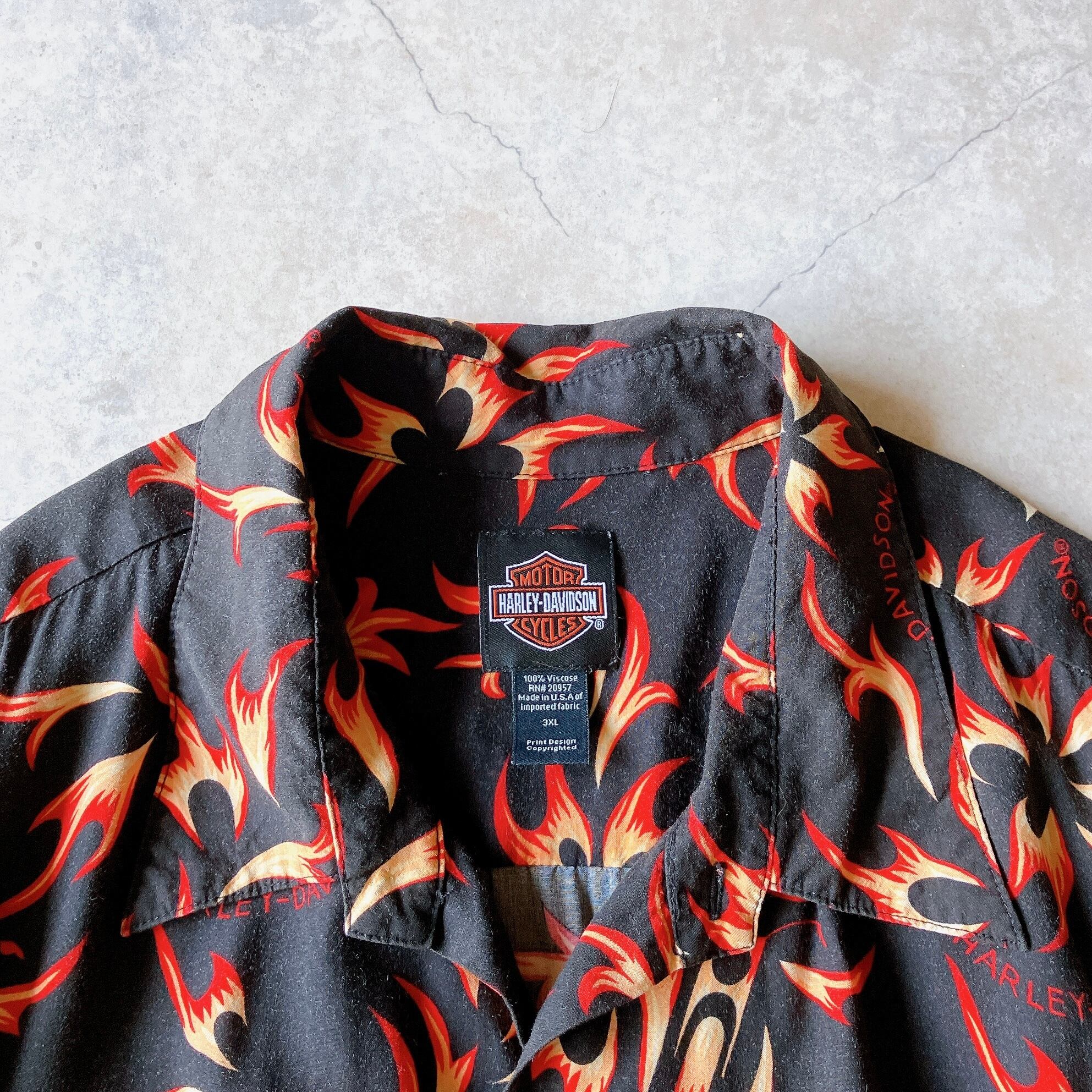 00's Harley-Davidson fire patterned open collar rayon shirt ハーレーダビッドソン ファイヤープリント 炎柄 レーヨン 半袖 開襟シャツ